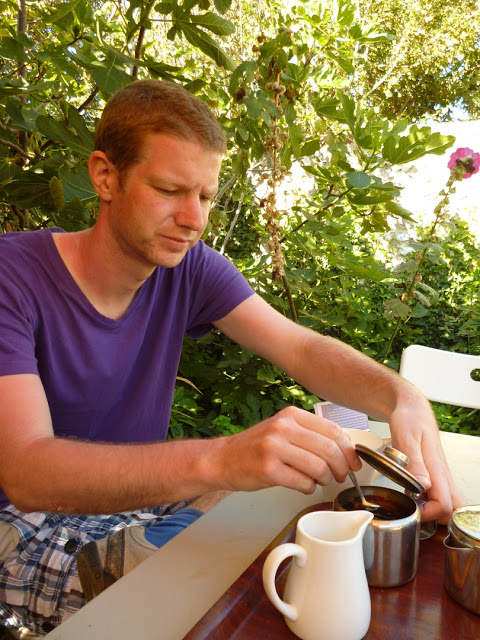 Tea & Hot chocolate in the gardens, a small haven on a beautiful sunny day, under a fig tree